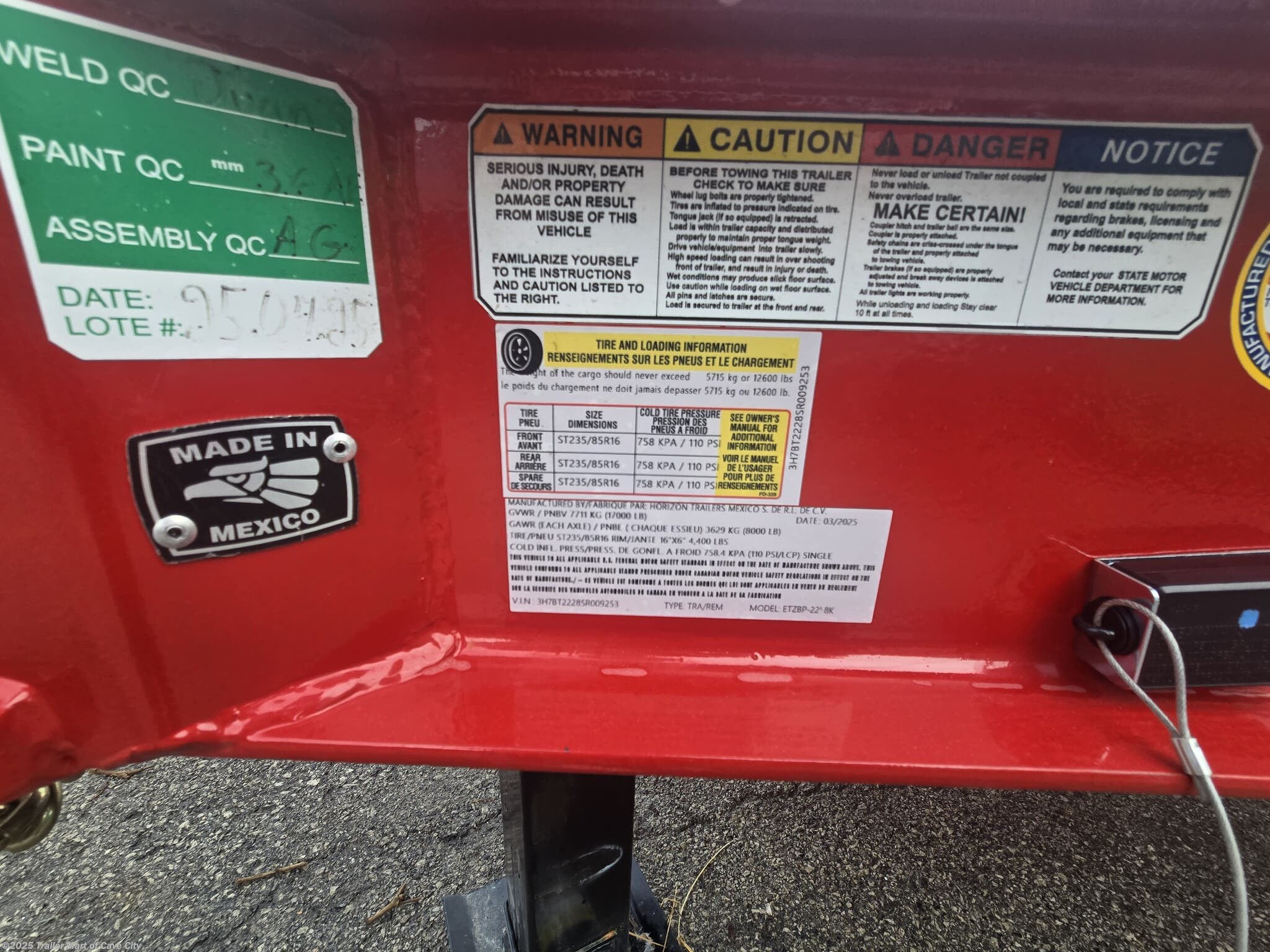 TRAILER WARRANTY: Three (3) Year Frame/One (1) Year Parts Warranty