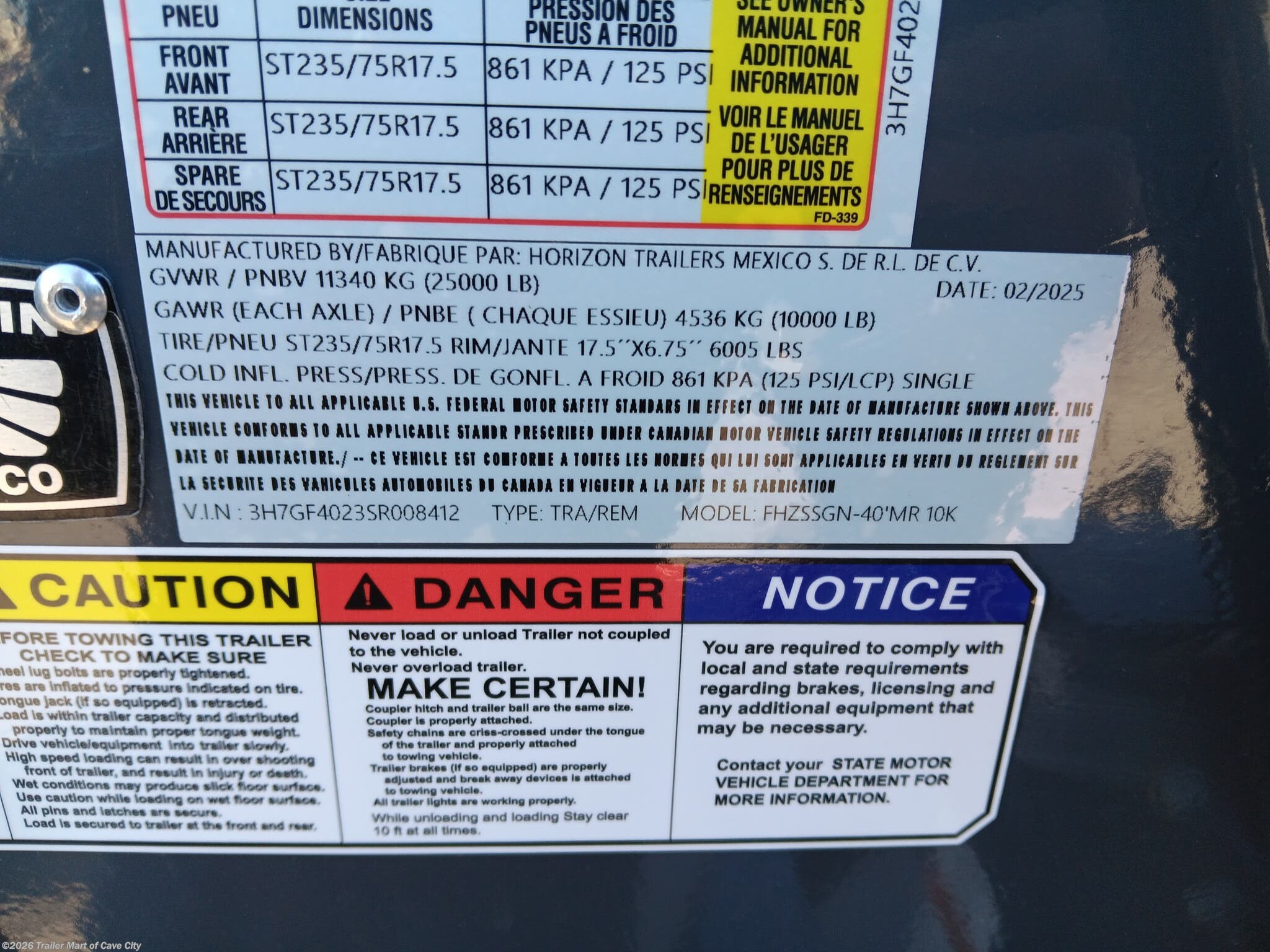 TRAILER WARRANTY: 3 YEAR FRAME / 1 YEAR PARTS WARRANTY
