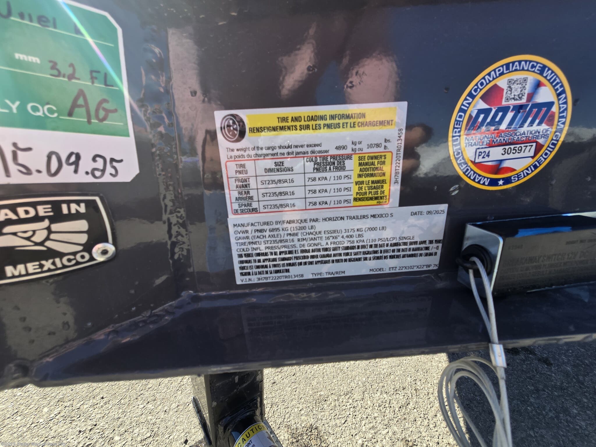 TRAILER WARRANTY: THREE (3) YEAR FRAME/ONE (1) YEAR PARTS WARRANTY