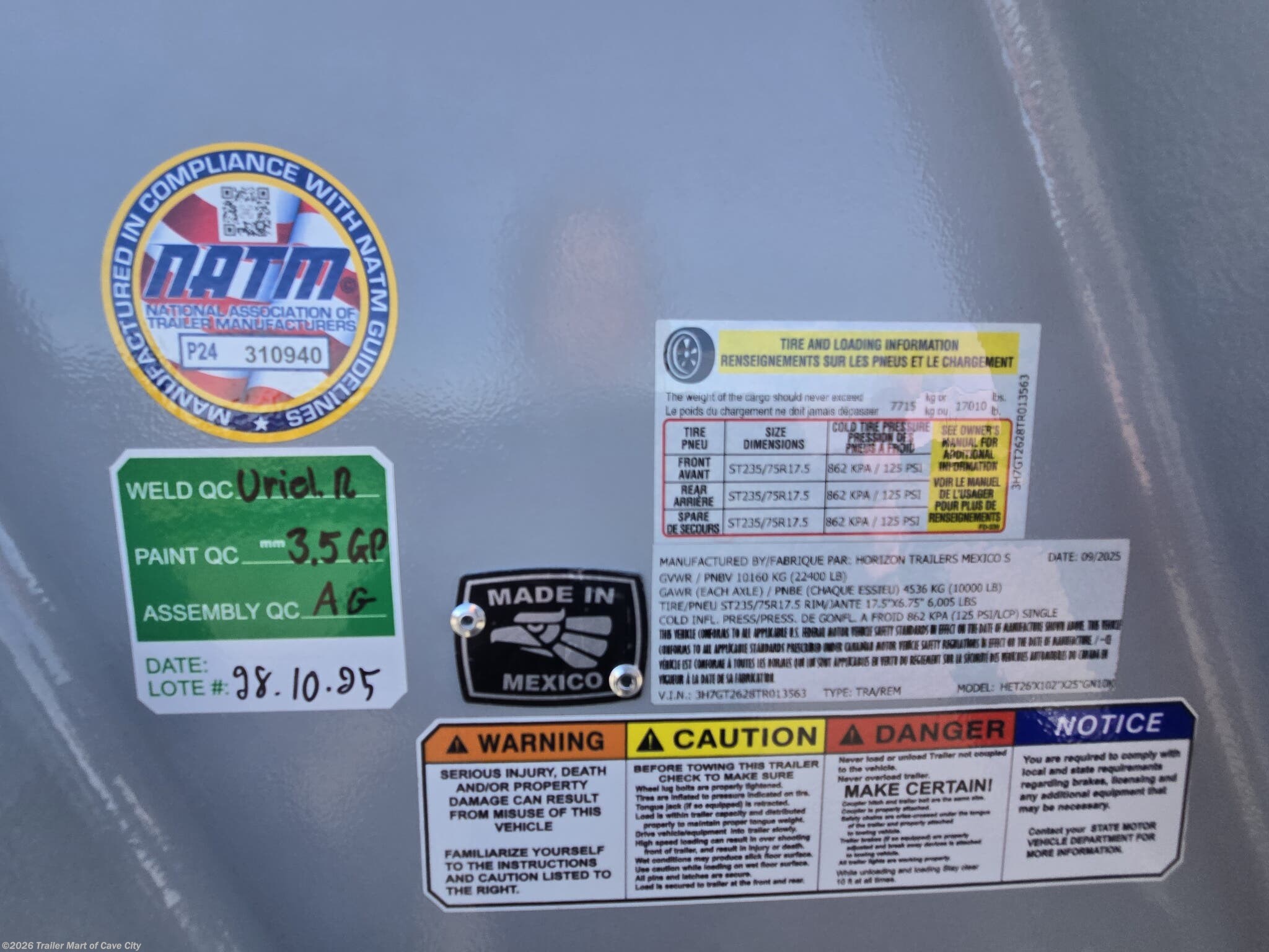TRAILER WARRANTY: 3 YEAR FRAME / 1 YEAR PARTS WARRANTY