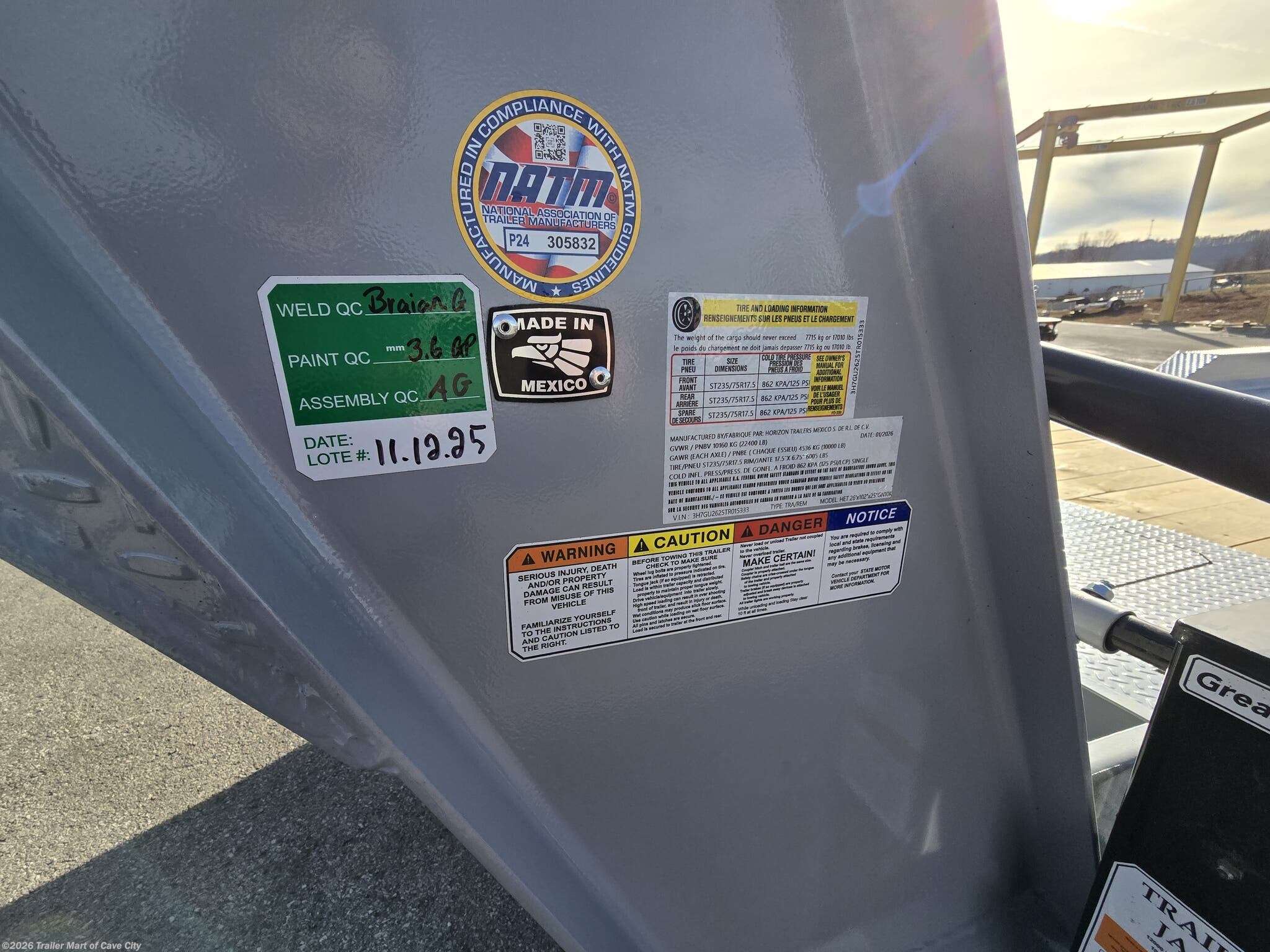 TRAILER WARRANTY: 3 YEAR FRAME / 1 YEAR PARTS WARRANTY