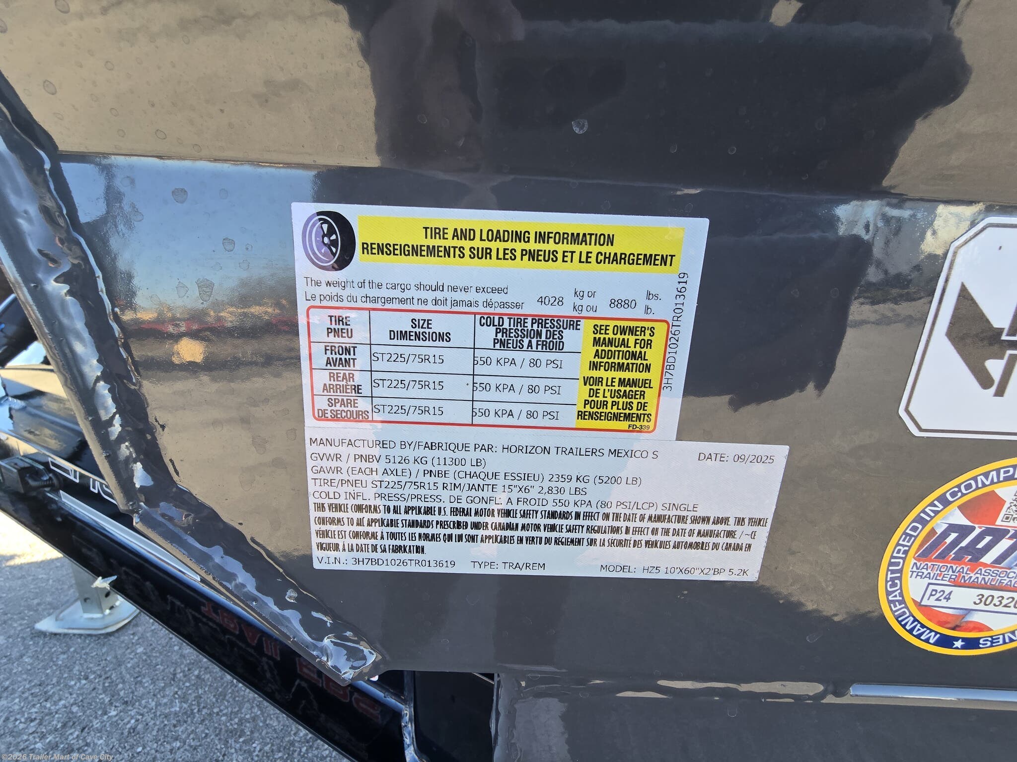 TRAILER WARRANTY: THREE (3) YEAR FRAME/ONE (1) YEAR PARTS WARRANTY